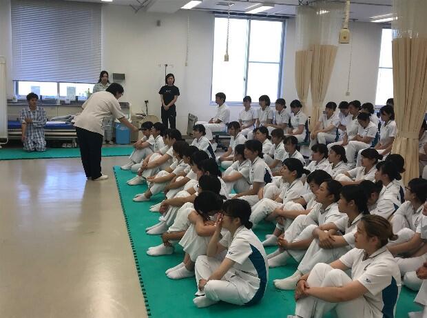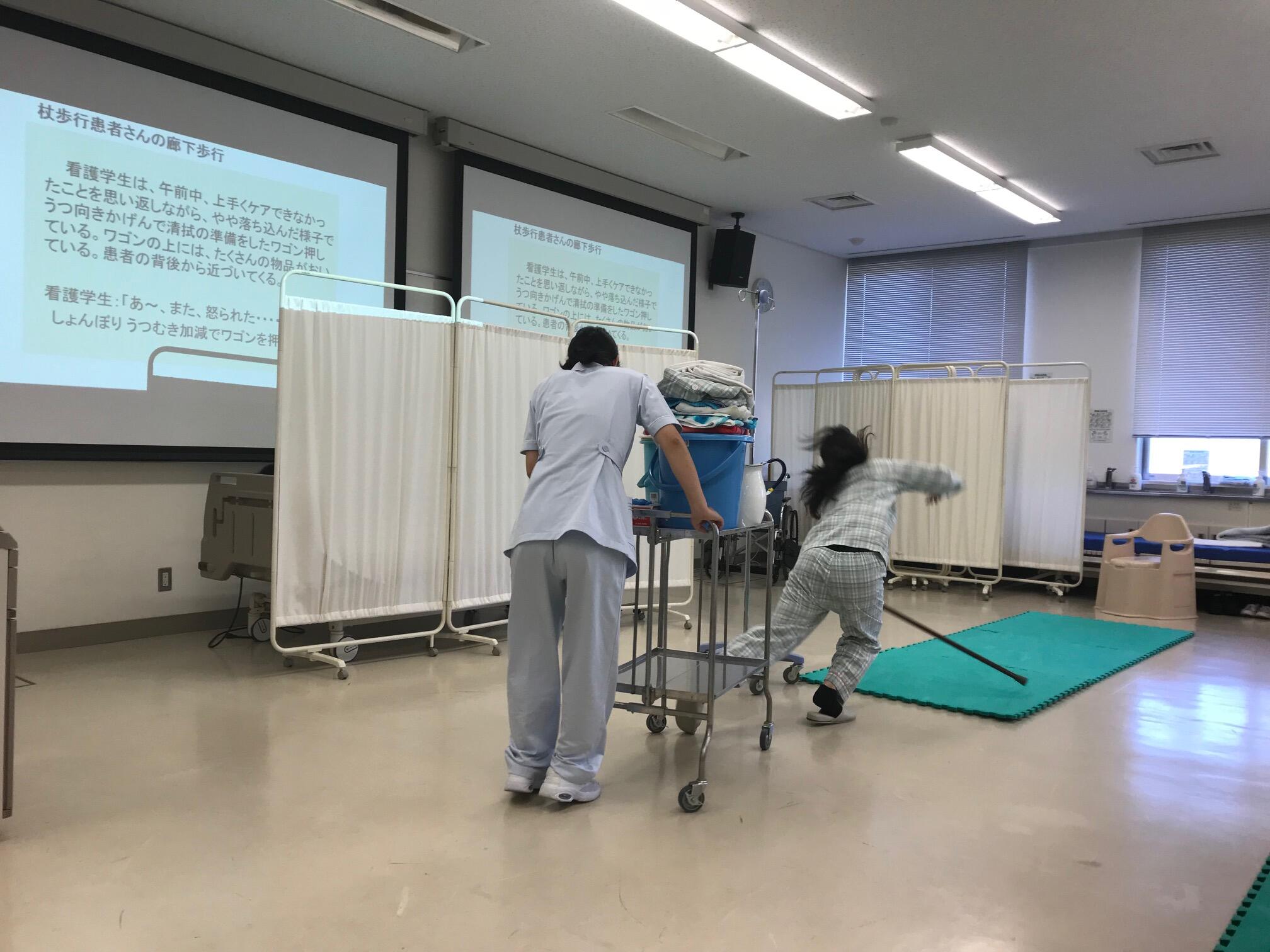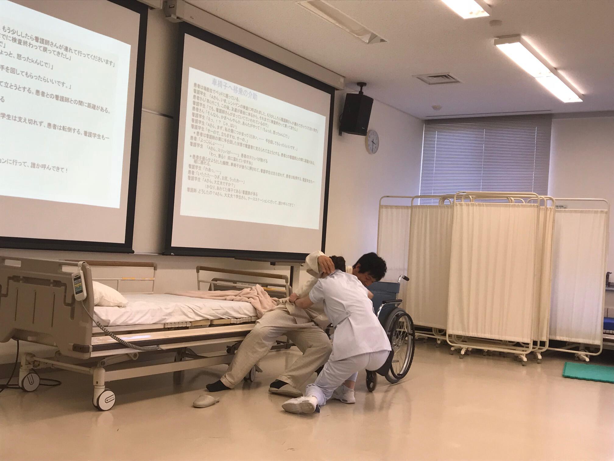 看護学生がカートを押していて、杖をついて歩いている患者さんに気付かず衝突して倒れさせてしまったり、ベッドからの移動介助の際に患者さんを転倒させてしまったり、リアルでダイナミックなアクションの連続に、学生からは大きなどよめきが起こっていました。