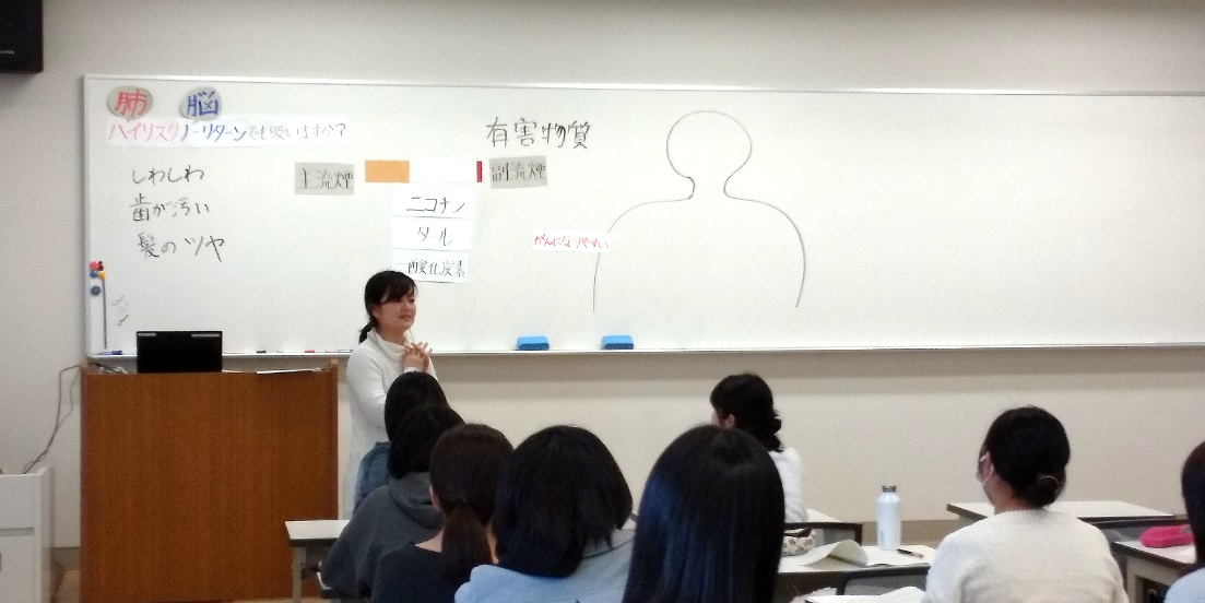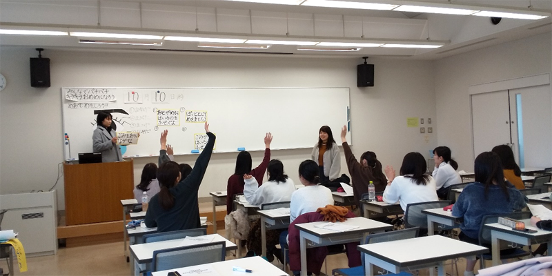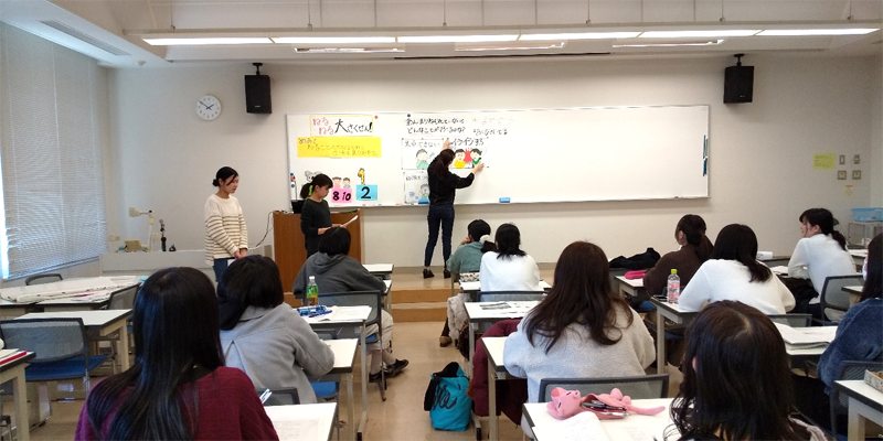 今年度も教職課程(養護教諭)の学生が教育実習に向けて、授業案や教材を作成し模擬授業を行いました。授業の導入部分に関心をもたせるような仕掛けやアクティブラーニングを取り入れる等、様々な工夫をしながらグループで協力して作り上げたことがわかる楽しい授業内容でした。対象となる児童・生徒の発達段階や健康上の課題をしっかり捉えて指導案を作成していく大切さが実感できた授業になったと思います。