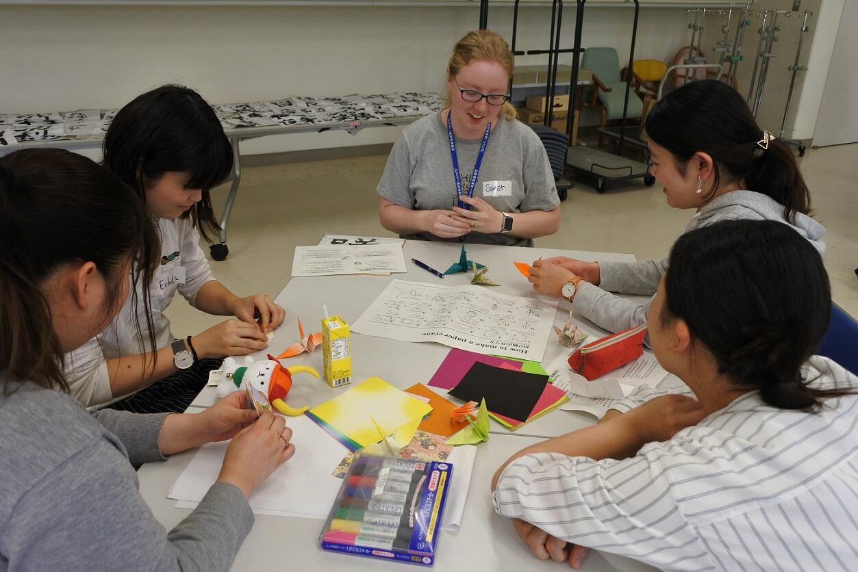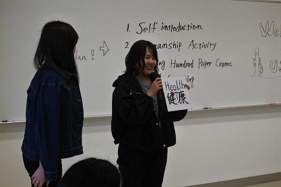 習字では、留学生の名前を漢字で書いたり、看護に関連する概念を書いて英語で説明したりしました。看護学生は不慣れな英語に苦戦しながら、調べた漢字の意味を必死に伝え、留学生ひとりひとりにぴったりな漢字の名前を考えました。折り紙は留学生の皆さんにとっては難しかったようで、ひとつの鶴を作るのに何分もかかりましたが、なんとか完成させました。折鶴(千羽鶴)の意味や日本での風習を伝え、日本の文化の一端に触れてもらうことができました。