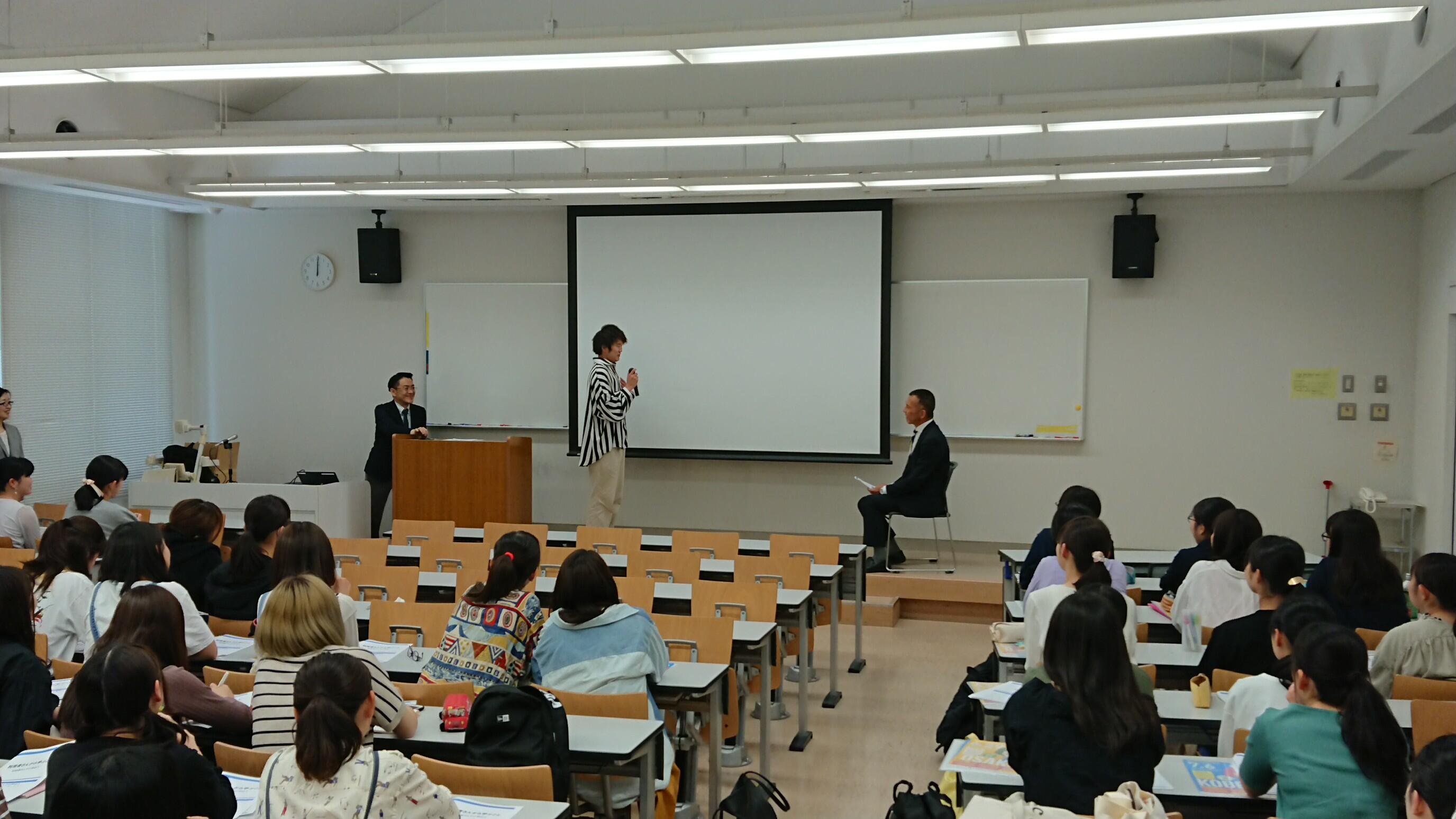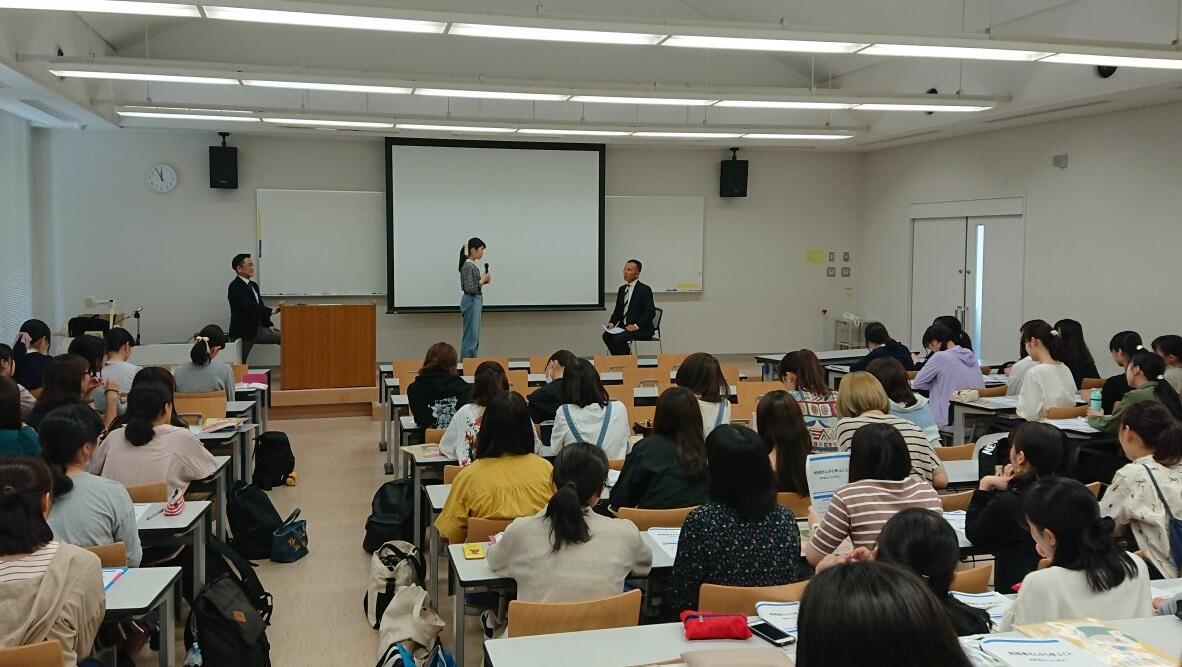 滋賀県立大学 人間看護学部では、1年生の5月から地域生活実習が始まり、夏には病院での実習も開始されます。入学して初めての実習となるため、実習に向けての準備のひとつとしてマナーセミナーを受け、1年生のうちからの社会人としてのマナーを身につけます。好ましい身だしなみや言葉づかいなど、具体的に説明があり、1年生のみんなは真剣に聴いていました。セミナーの最後には、実際の実習場面を想定したロールプレイングを行い、患者さんへの受け答えについて理解が深まりました。