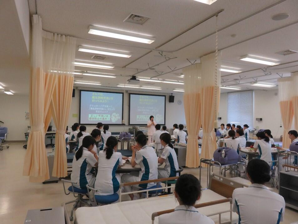 いよいよ、1年次のみなさんが待ちに待ったユニフォームでの本格的な演習が始まりました。初めてのユニフォームを着ての演習では、患者様の安全や安楽を守るために重要な要素である医療従事者としての身だしなみ・衛生学的手洗い・手指消毒方法について学びました。