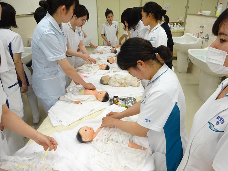 実習で実際に対象者さんに行う看護技術を、リアルな人形モデルを使って練習しています。