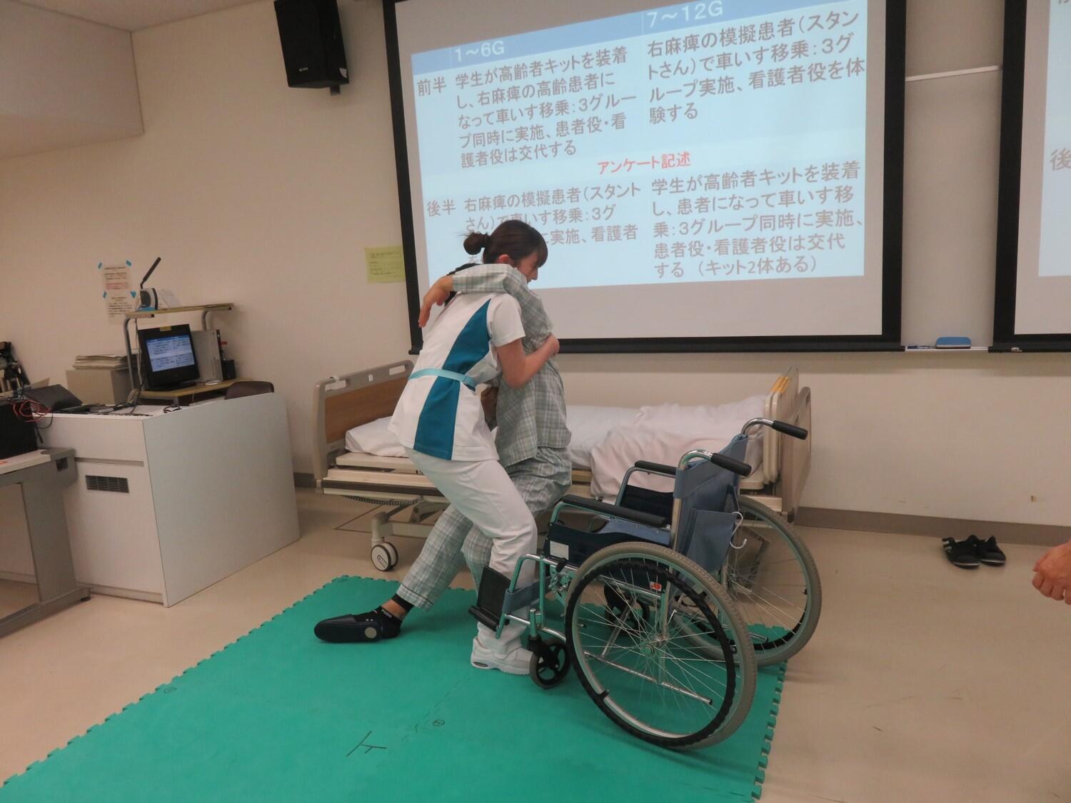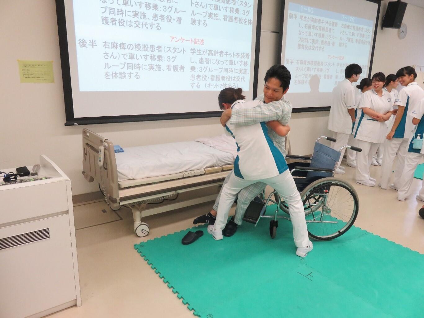 授業では、倉田プロモーションでスタントマンとして活躍されている方が患者を演じて下さり、4回生の学生・教員が新人・先輩看護師役になり医療事故現場を再現しました。授業の後半では、一人一人の学生が看護師役になり、プロのスタントマンさんに患者役を演じてもらい、ベッドから車いすへの移動時の危険場面を再現し、医療事故を実体験してもらいました。