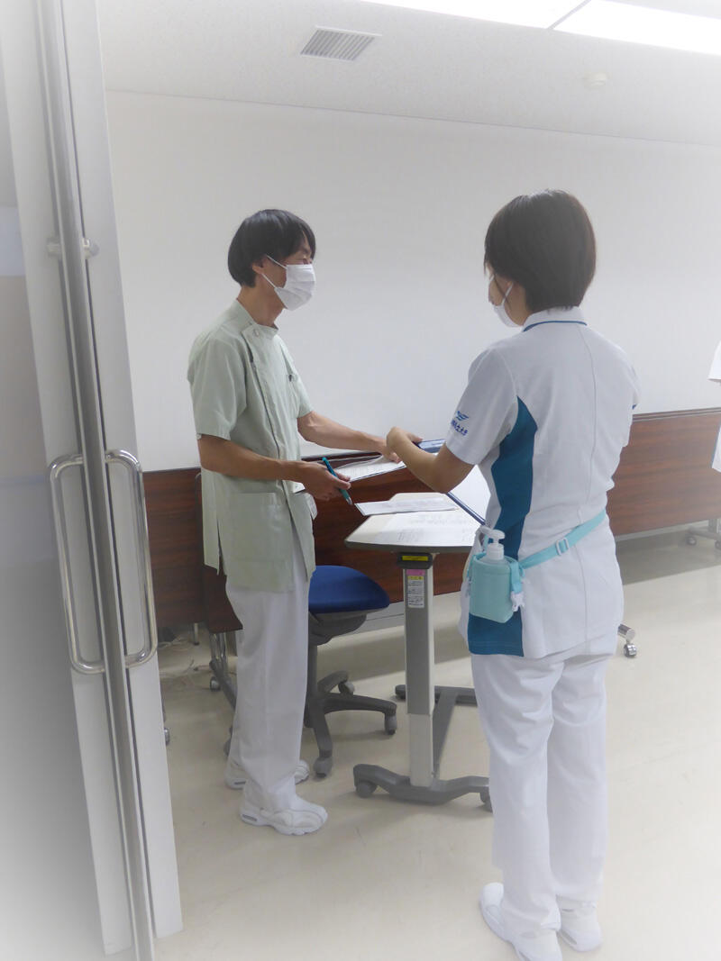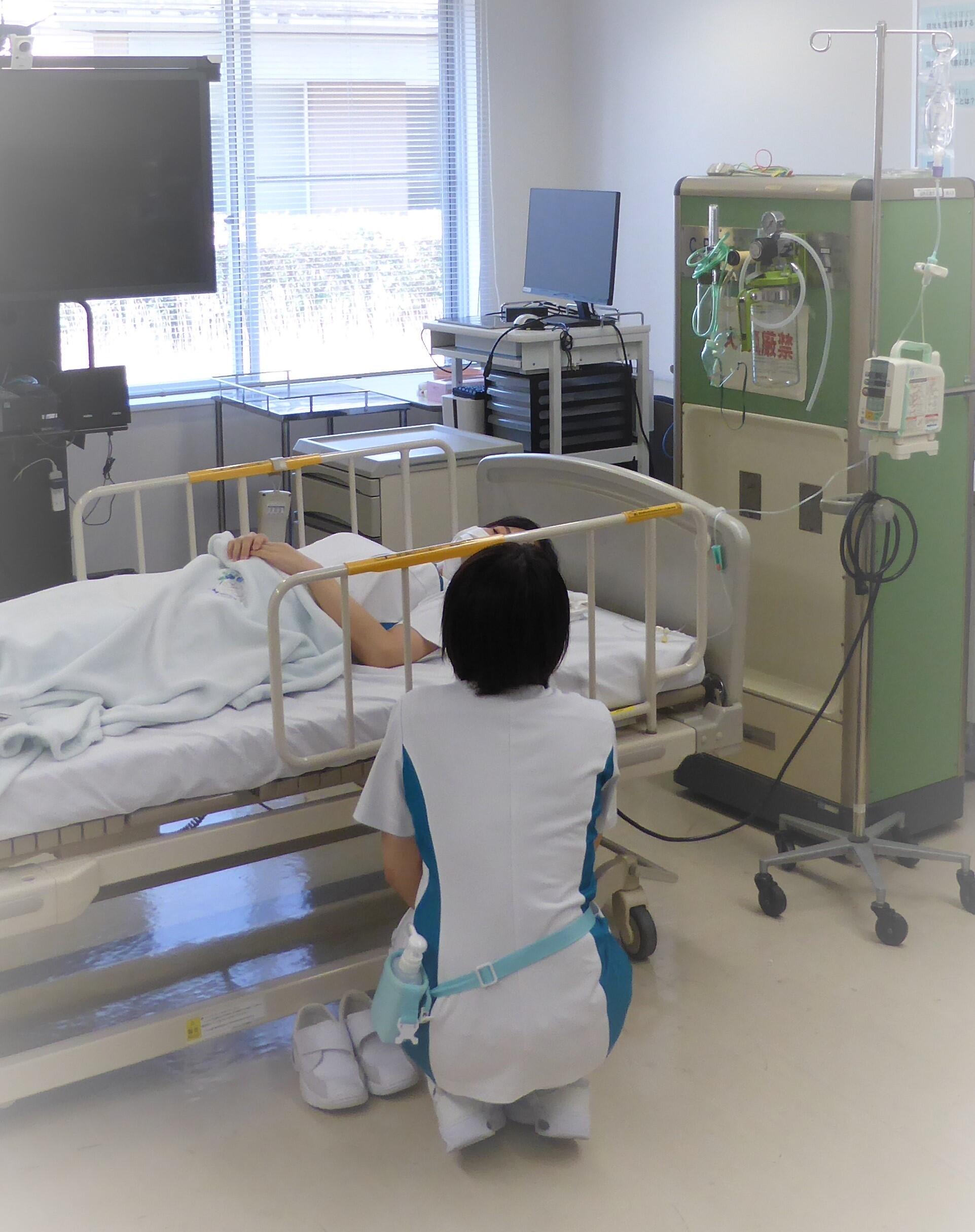 人間看護学部では、エンド・オブ・ライフにある患者さんとそのご家族への看護を学ぶ「エンド・オブ・ライフ実習」を行っています。今年度は、新型コロナウイルス感染症の流行により、実習の一部を学内演習で行っています。今回は、エンド・オブ・ライフにある患者さんの苦痛・苦悩に配慮しながら、全身状態のアセスメントを行うシミュレーションを行いました。臨地実習と同様に、観察したことを臨床指導者さんに報告するところまでを実践しました。 実践してみたからこそわかる、新たな気づきを得ることができました。