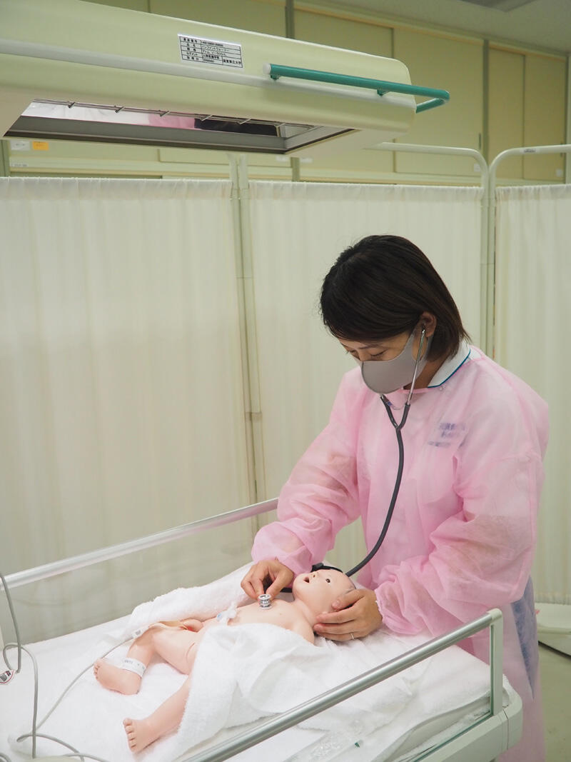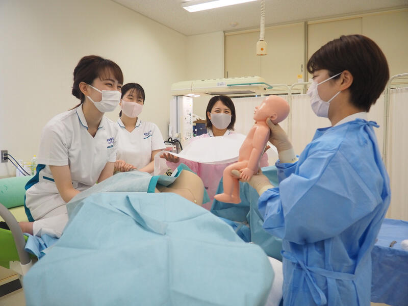 今回は、9月から始まる助産実習にむけて、妊婦健康診査・分娩介助・新生児介助の演習をしている場面です。これからはほぼ毎日のように、授業時間以外の時間を見つけて、技術の練習に励みます。こうした努力の積み重ねを経て、助産実習に臨みます。