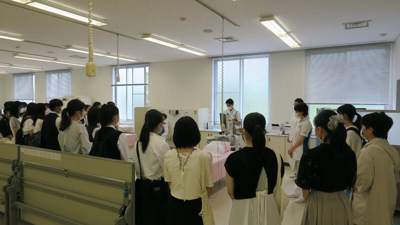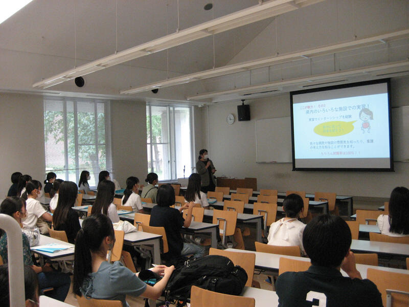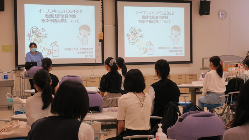 人間看護学部では、各実習室の見学と手洗い・手指消毒体験、学部説明・入試説明を企画運営しました。