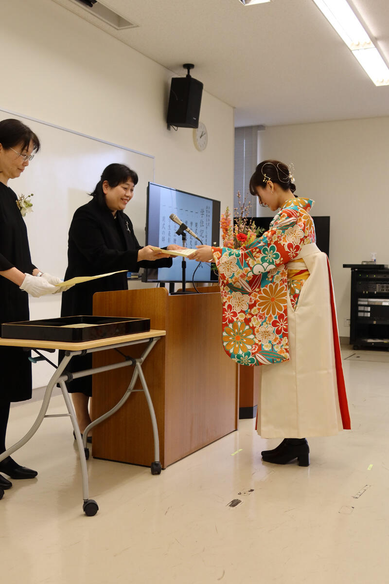 振袖袴やスーツに身を包んだ卒業生・修了生は皆、晴れやかな表情で式典に臨んでいました。