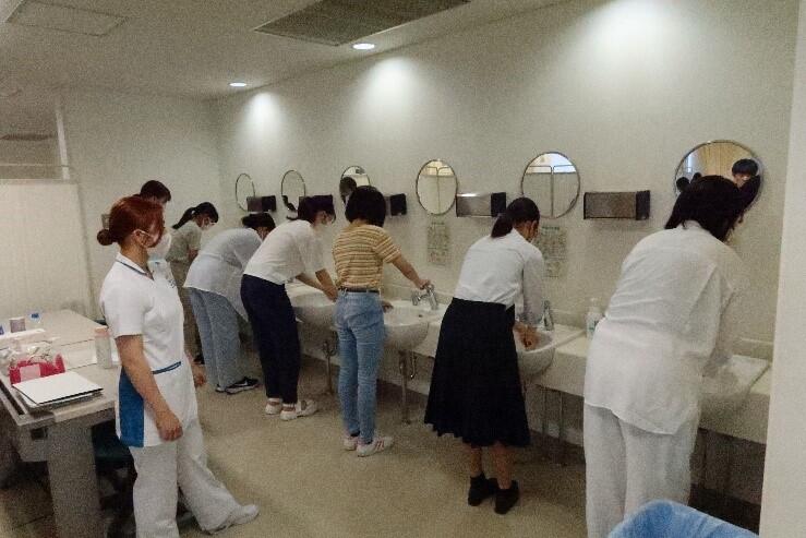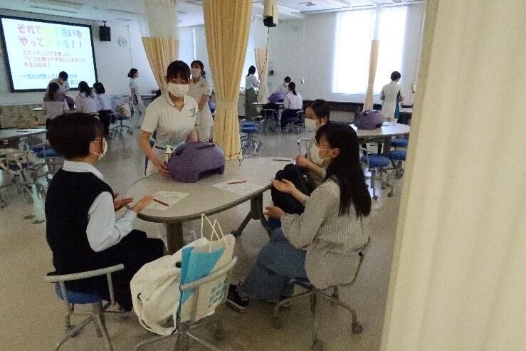 人間看護学部では、学部・入試説明会をはじめとし、「手洗い・手指消毒」体験、実習室見学などを企画しました。在校生と交流していただける場面がたくさんあり、本学の魅力を知っていただく機会になったと思います。