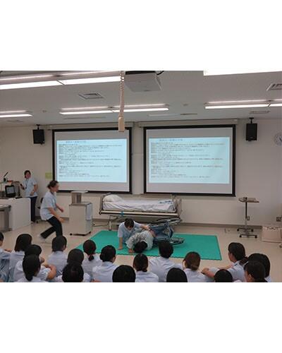 医療安全教育の一環として、本学部では3年前よりプロのスタントマンに模擬患者役を演じていただき、医療事故が起こりやすい状況下での看護場面を再現し、学生に医療事故の危険性について体験を通して学習する演習を行っています。