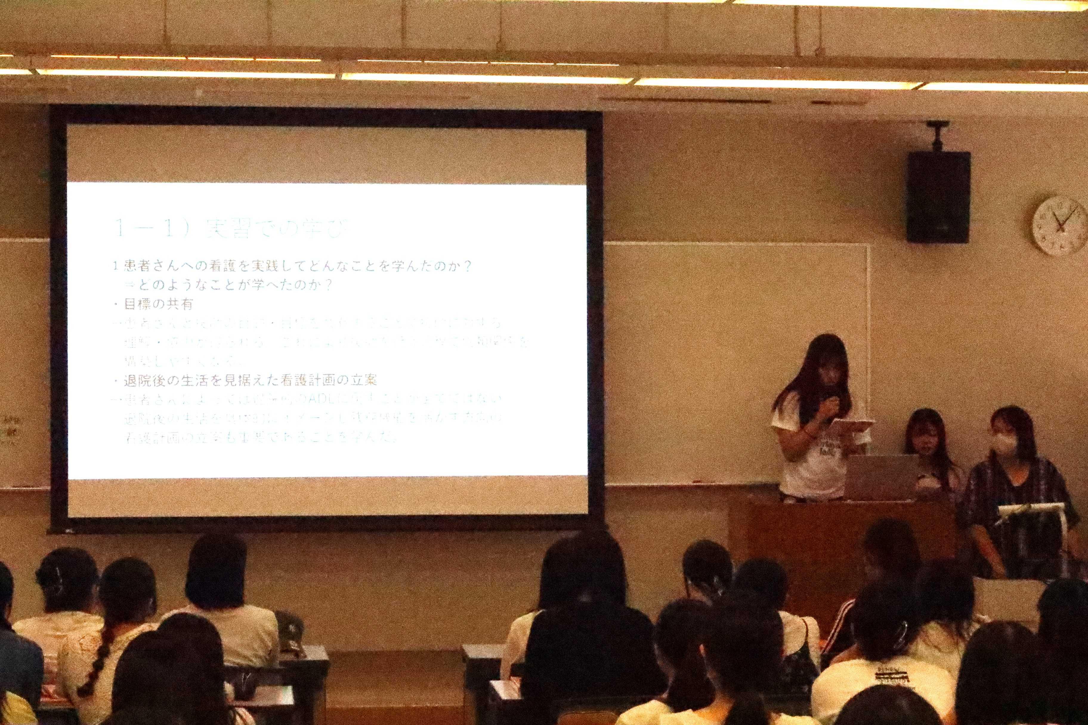 7月に4回生科目:人間看護学統合実習、8、9月に1、2回生科目:基礎看護学実習Ⅰ・Ⅱを実施し、それぞれの最終日に実習の学びをまとめたものを発表しました。その際、フリーランスイラストレーターである大道レイチェルさんをお招きし、グラフィックレコーディングをしていただきました。グラフィックレコーディングとは、ミーティングでの議論内容や提案を、絵や図形などのグラフィックを用いてリアルタイムにまとめる手法です。今回は、実習のまとめの発表会の中から、重要となる要素をビジュアル化することで、学生によりわかりやすく学びを共有することを目的として導入しました。発表者の似顔絵や発表内容を可愛くデザインしていただき、学びを深めるとともに楽しく学べる機会になりました。