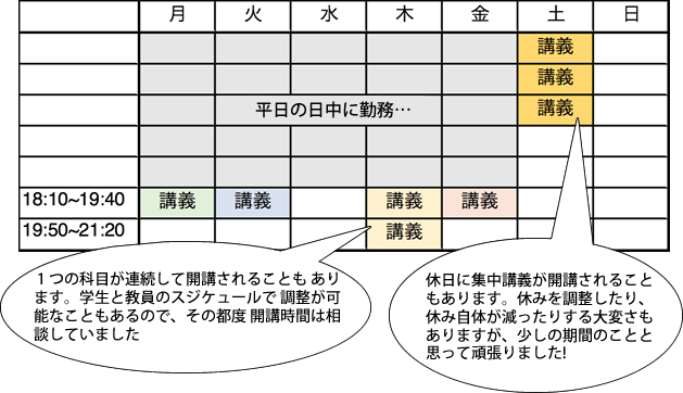入学後は、病院での勤務をパートタイムに変更しました。大学院での授業は、履修する科目ごとに、教科担当の先生と他の院生との間で日程調整を行いました。6・7限の時間を基本として、土日や平日休みの時間を利用することで、仕事と並行しながら授業に参加することができました。
