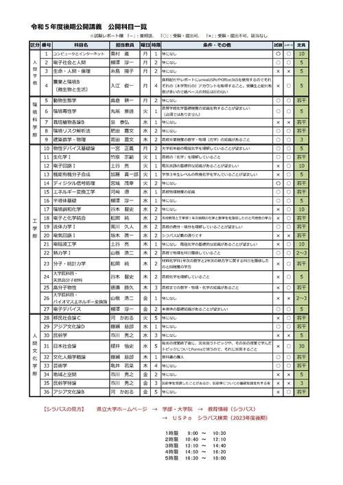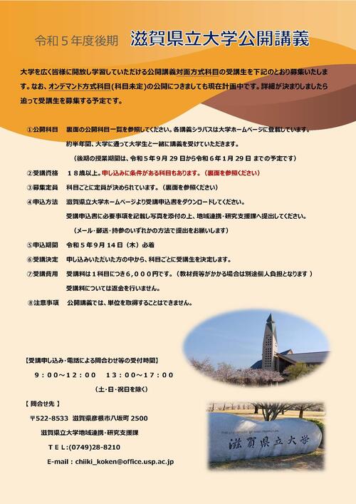 滋賀県立大学では、令和5年度後期公開講義(対面方式科目)の受講生を下記のとおり募集いたします。