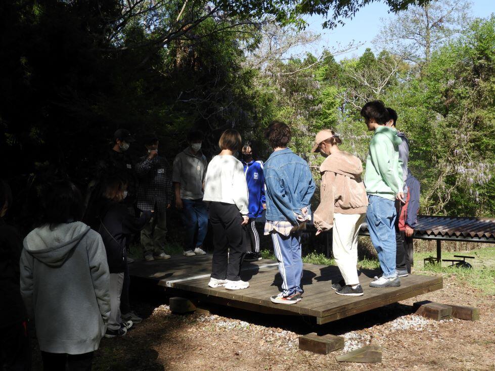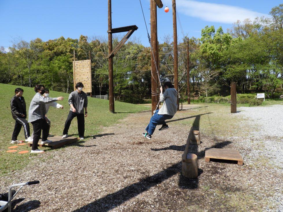 午後からは、屋外に設置されている施設を使い少し高度なプログラムにチャレンジしました。実際に身体を使った活動となり、達成度に個人の差がつきやすいため、周りのサポートや行動の工夫が必要となってきます。学生たちはアドバイスや声がけをしたり、挑戦する順番を入れかえるなど知恵を絞っていました。