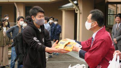 4月19日(水曜日)のお昼に贈呈式を挙行した後、代表取締役社長 上田健一郎様をはじめ千成亭風土の社員の皆さまから直接配布いただきました。