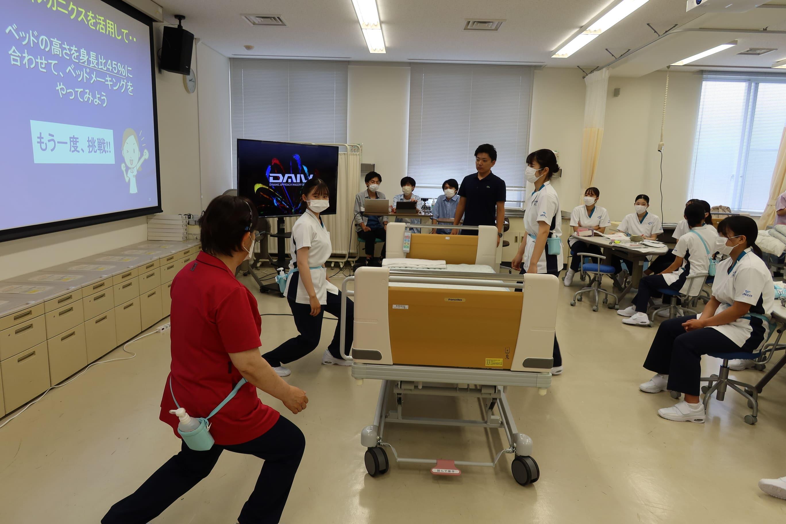 本学部では、看護動作時のボディメカニクスについて、人間工学の視点から、工学と看護学の教員とで共同研究開発した腰痛予防デバイスを活用した看護技術演習を行っています。今年も1回生を対象に7月の基礎看護技術Ⅰにて本学部基礎看護学講座の伊丹君和教授、千田美紀子講師、関恵子講師、村川弥生氏(本学部院生)と青山学院大学理工学部電気電子工学科の伊丹琢助教らと共同で技術演習が行われました。学生たちは携帯用の腰部負担計測機器を装着し、ベッドメーキング(入院患者のベッドを作成する)を実施しました。腰部負担計測機器は、看護動作時に腰部負担のかかる前傾姿勢を、音と映像で振り返ることが可能です。学生たちは、自身の看護動作を振り返りながら、安全で腰部負担のかからない看護動作を体得していきます。看護職の腰痛ゼロを目指して、次年度以降も継続していく予定です。