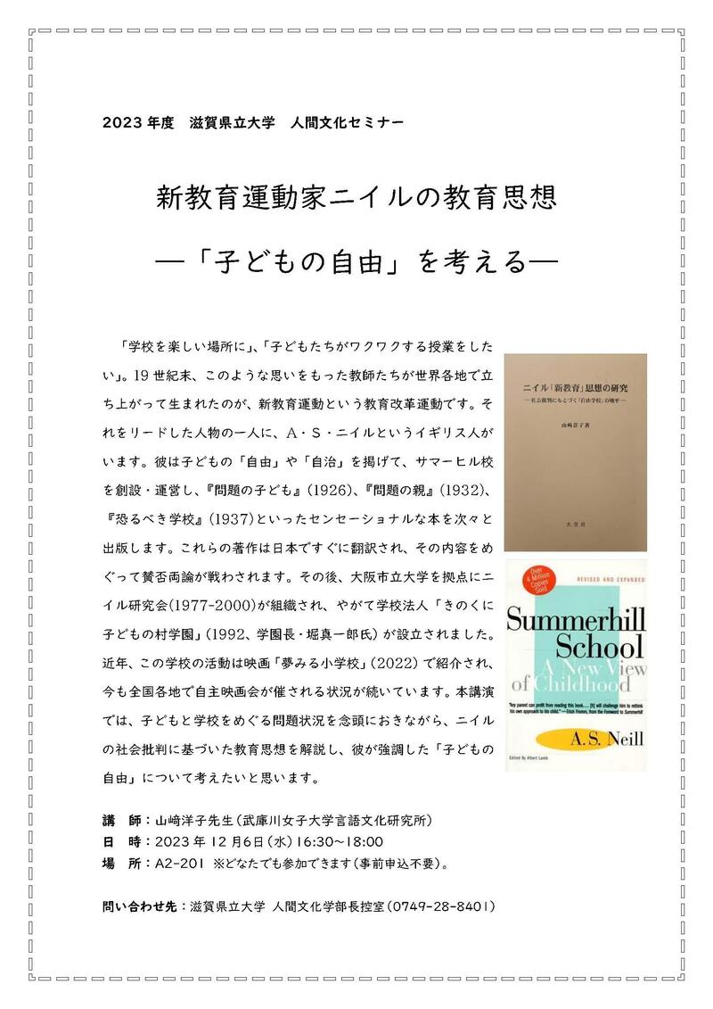 人間文化セミナー『新教育運動家ニイルの教育思想-「子どもの自由」を考える-』を開催します(2023年12月6日)
