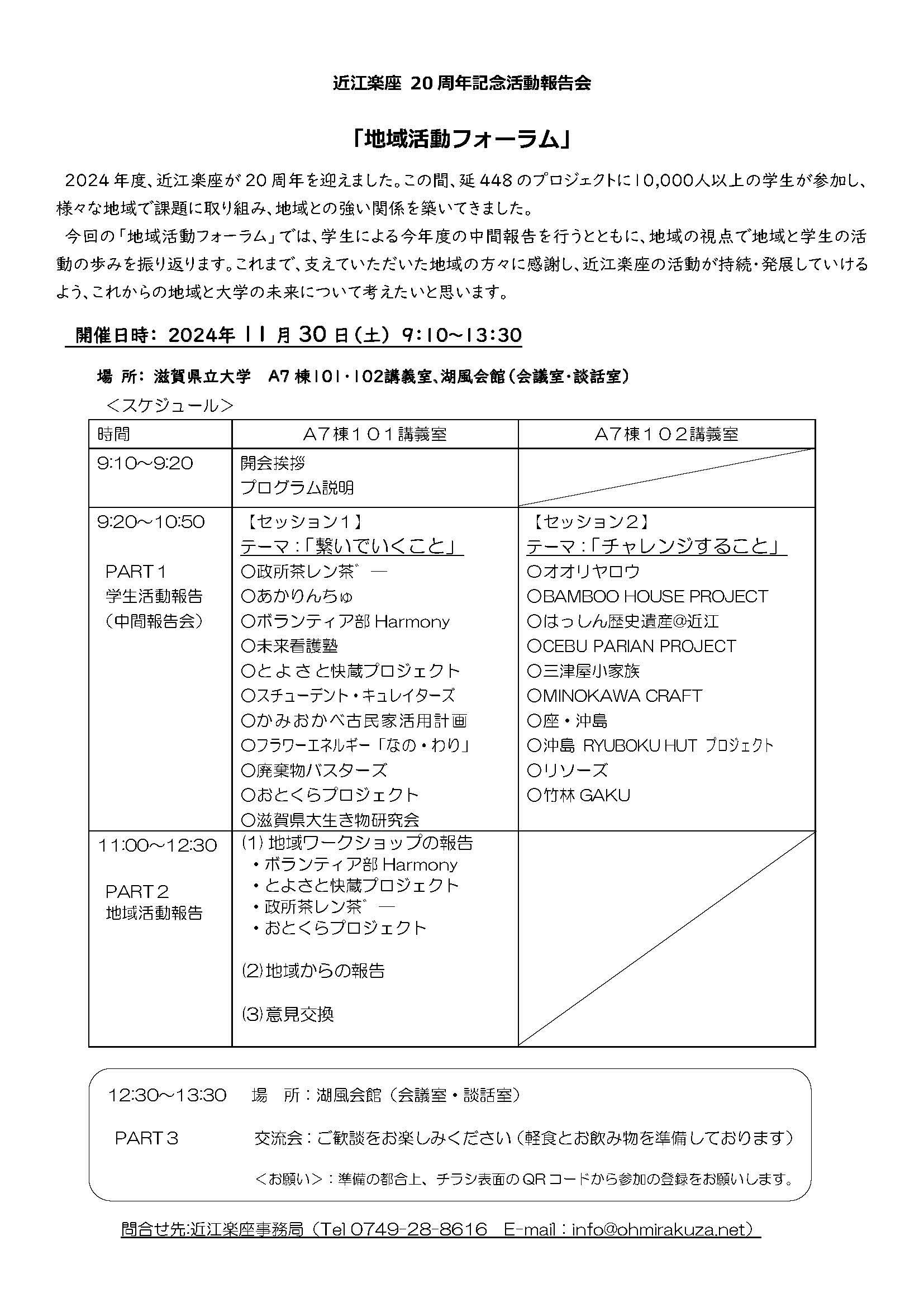 今回の「地域活動フォーラム」では、学生による今年度の中間報告を行うとともに、地域の視点で地域と学生の活動の歩みを振り返ります。これまで、支えていただいた地域の方々に感謝し、近江楽座の活動が持続・発展していけるよう、これからの地域と大学の未来について考えたいと思います。