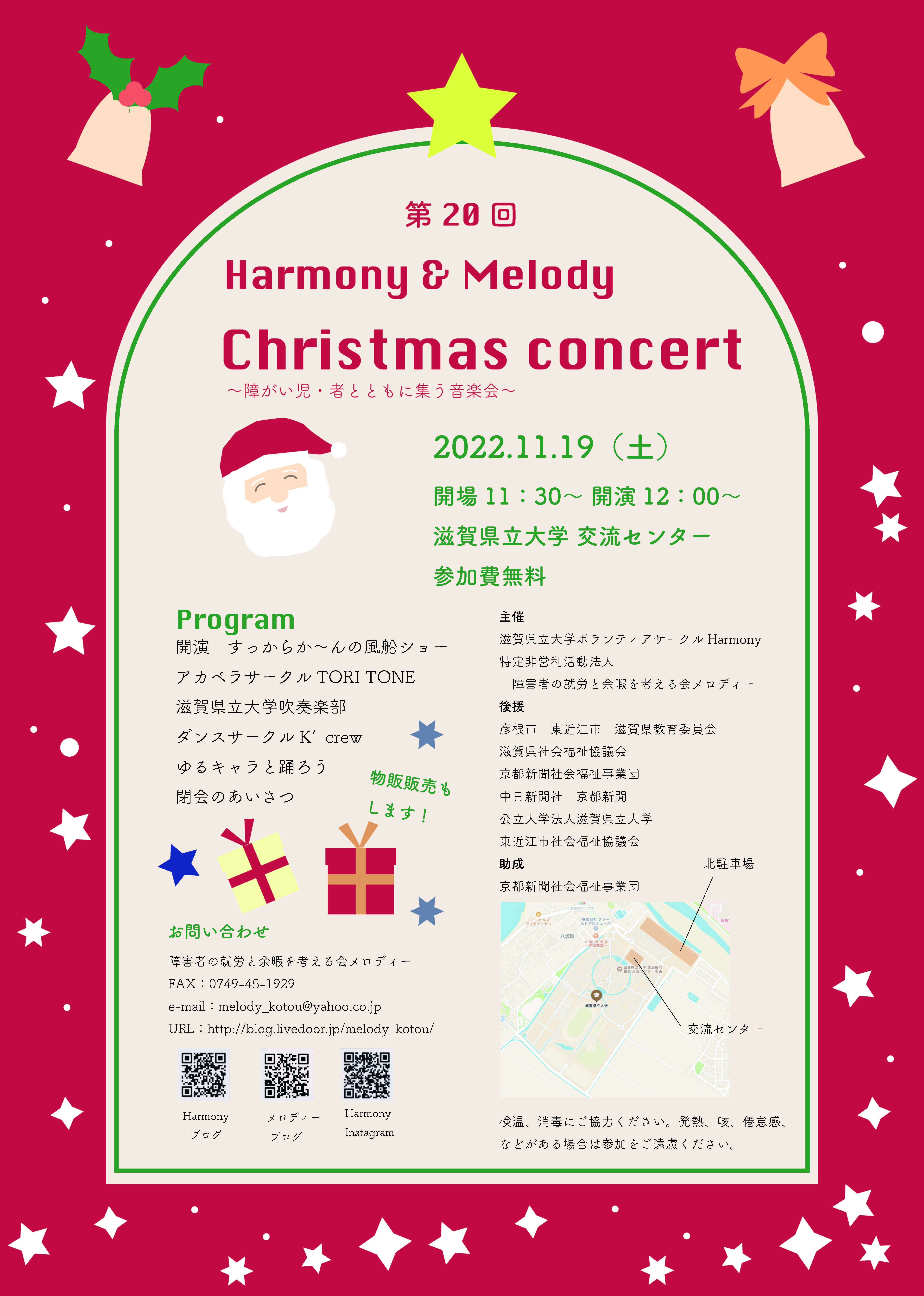 障がい児・者の就労や、余暇の過ごし方を支援する活動を行っている滋賀県立大学 近江楽座 "ボランティアサークルHarmony"と"NPO法人障害者の就労と余暇を考える会メロディー"が共同で企画しました「第20回 障がい児・者とともに集う音楽会 Harmony&メロディー クリスマスコンサート」について、下記のとおり開催します。