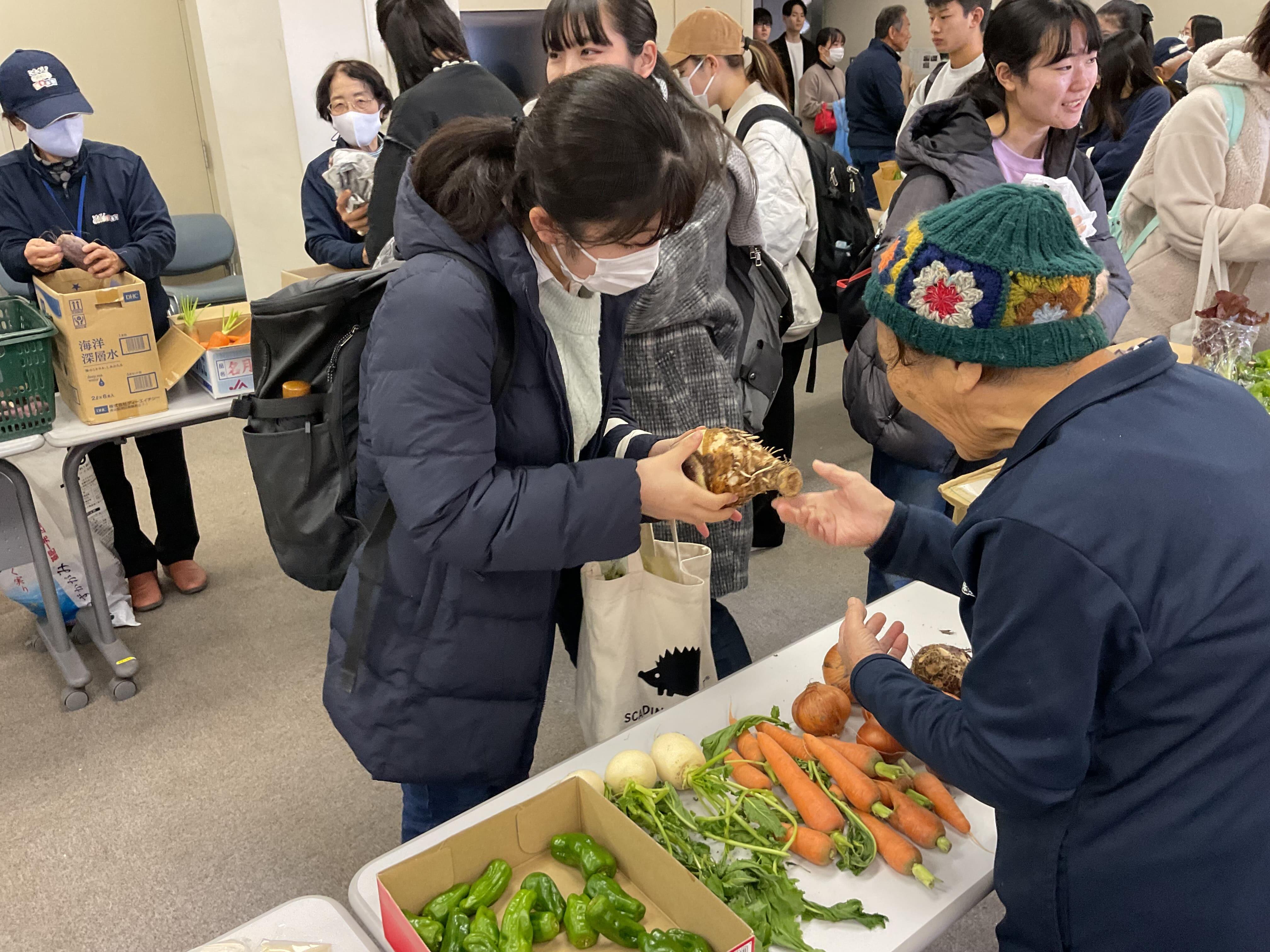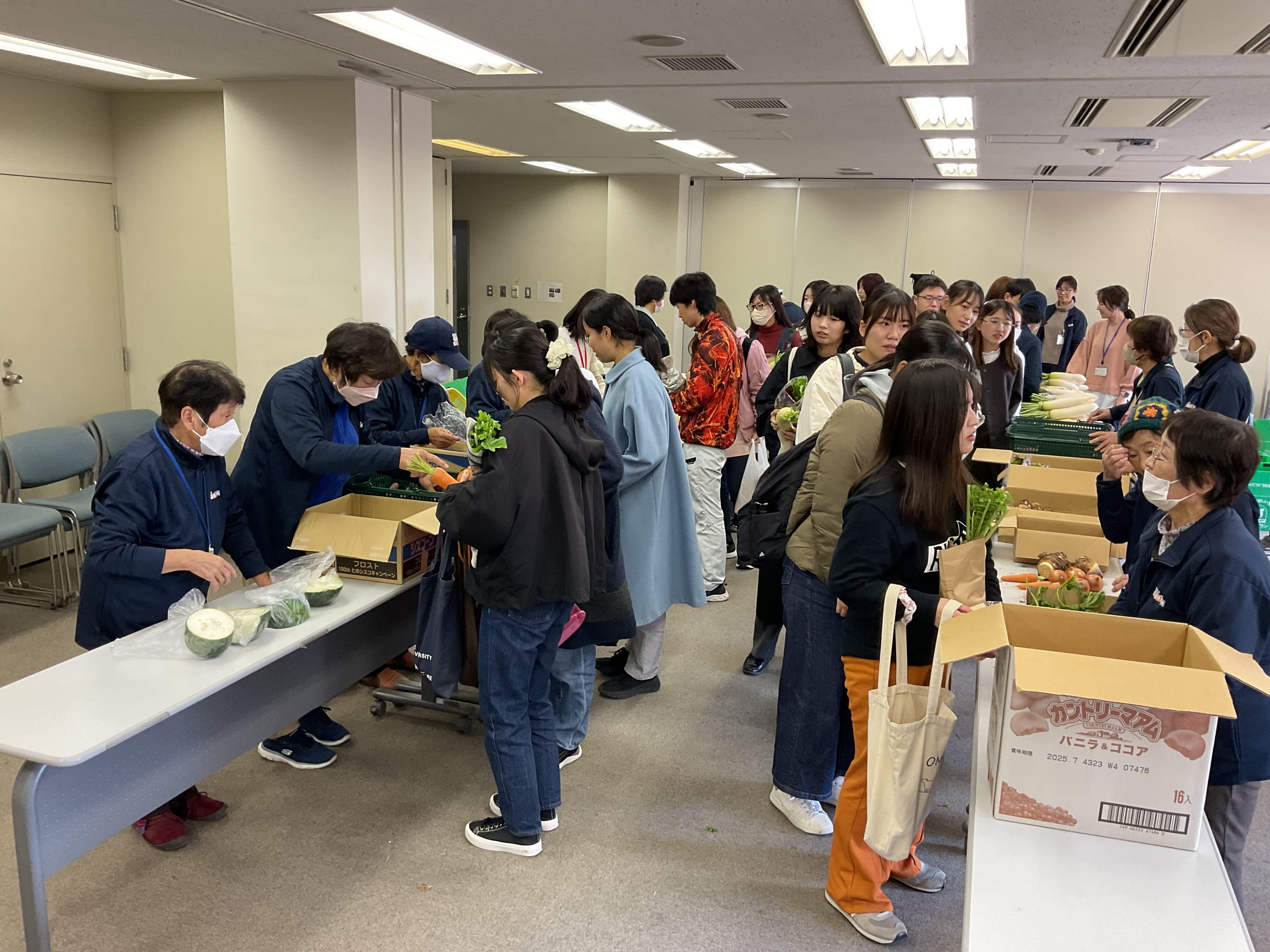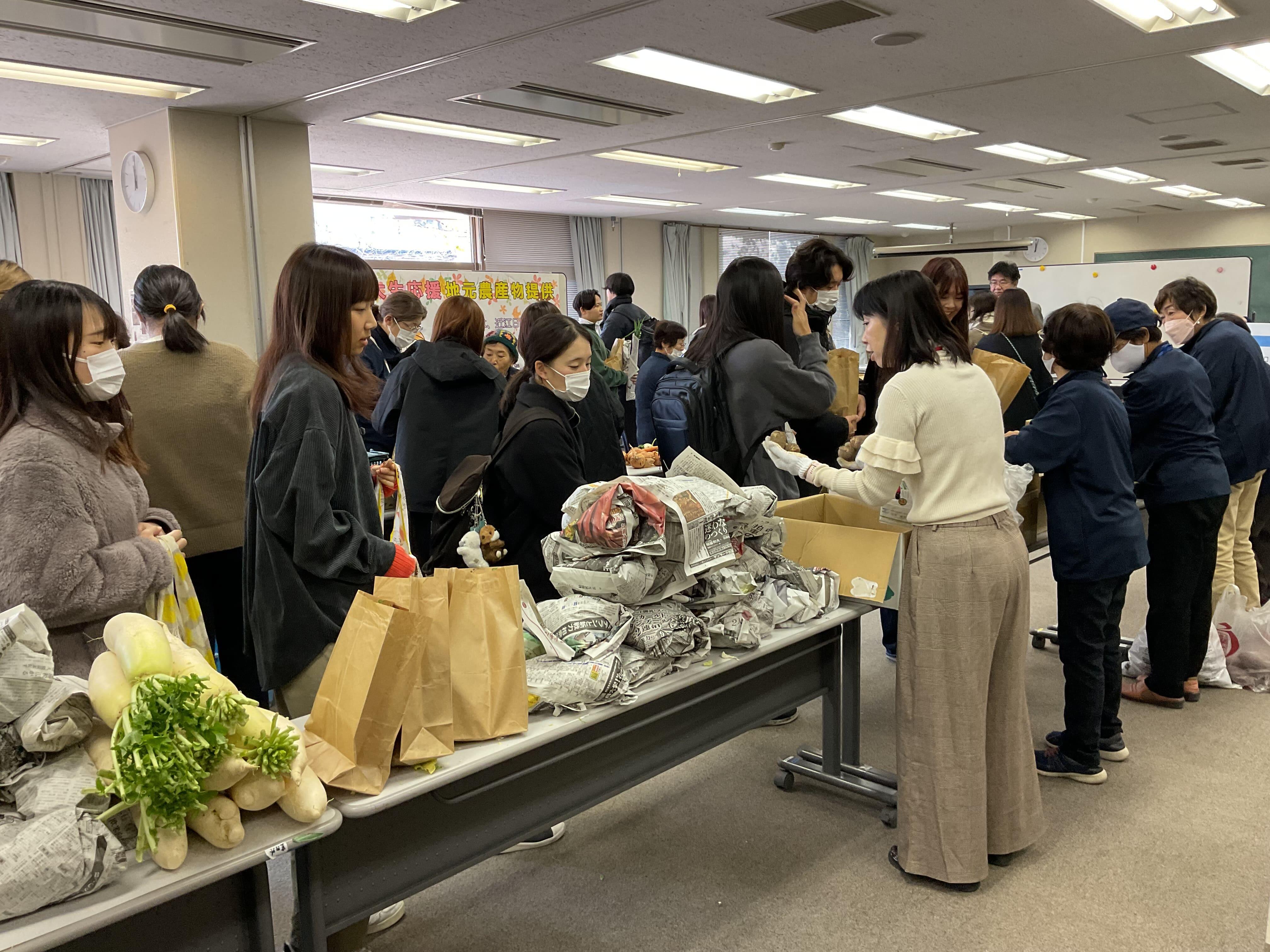 12月3日、(社)近江日野交流ネットワーク様および日野町の農家の皆様からのご厚意により、本学学生約200名に対しお米や野菜などを配布いただきました。日野町でとれたお米や大きな大根、白菜、サツマイモ、里芋のほか、手作りのお餅などをご提供いただきました。物価高騰でこれまでになく厳しい学生生活を過ごす本学学生へのこのような心温まるご支援に心から感謝申し上げます。