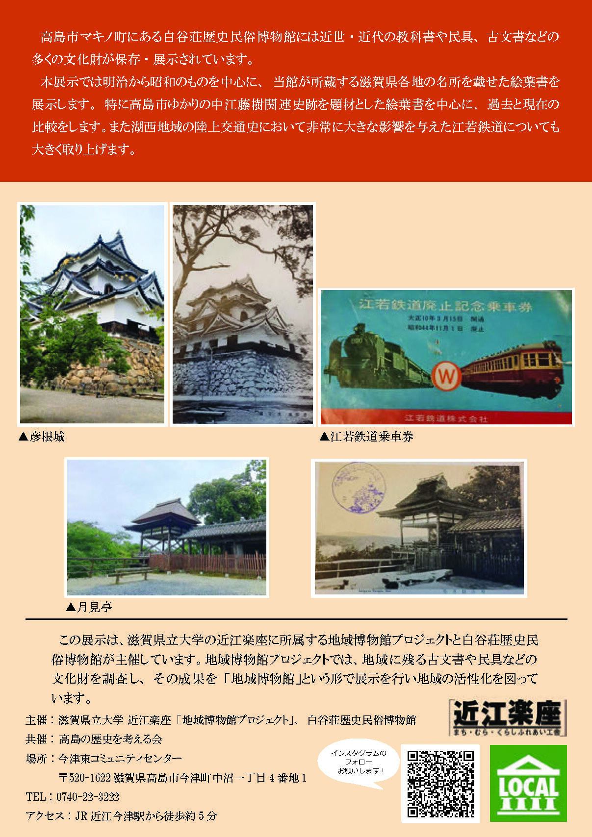 滋賀県立大学「近江楽座」の団体"地域博物館プロジェクト"が『古絵葉書等に映った近江のむかしー白谷荘歴史民俗博物館に残る絵葉書たちー』と題して企画展示を行います