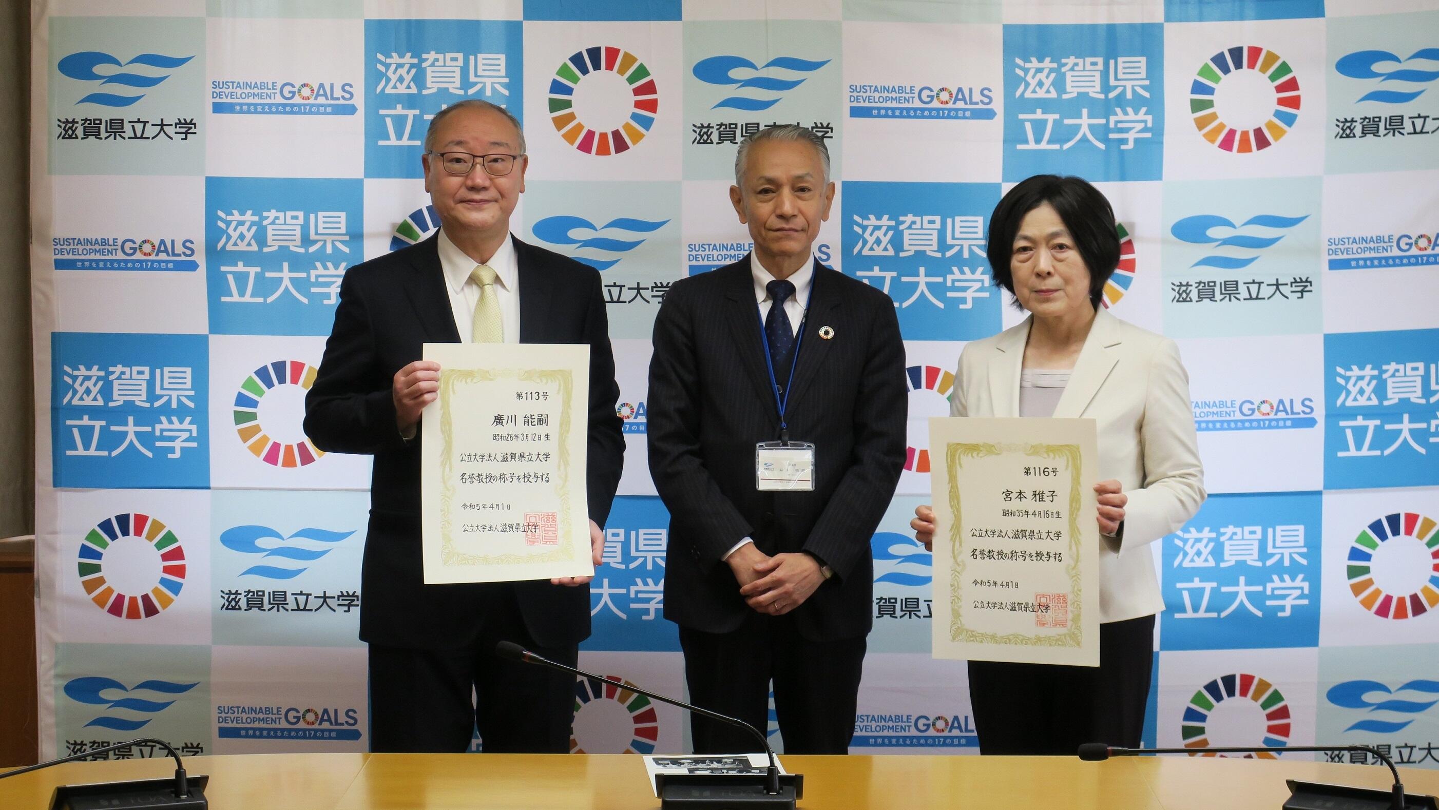 本年3月に退職されました廣川能嗣先生と宮本雅子先生が出席され、井手理事長より名誉教授の称号が授与されました。