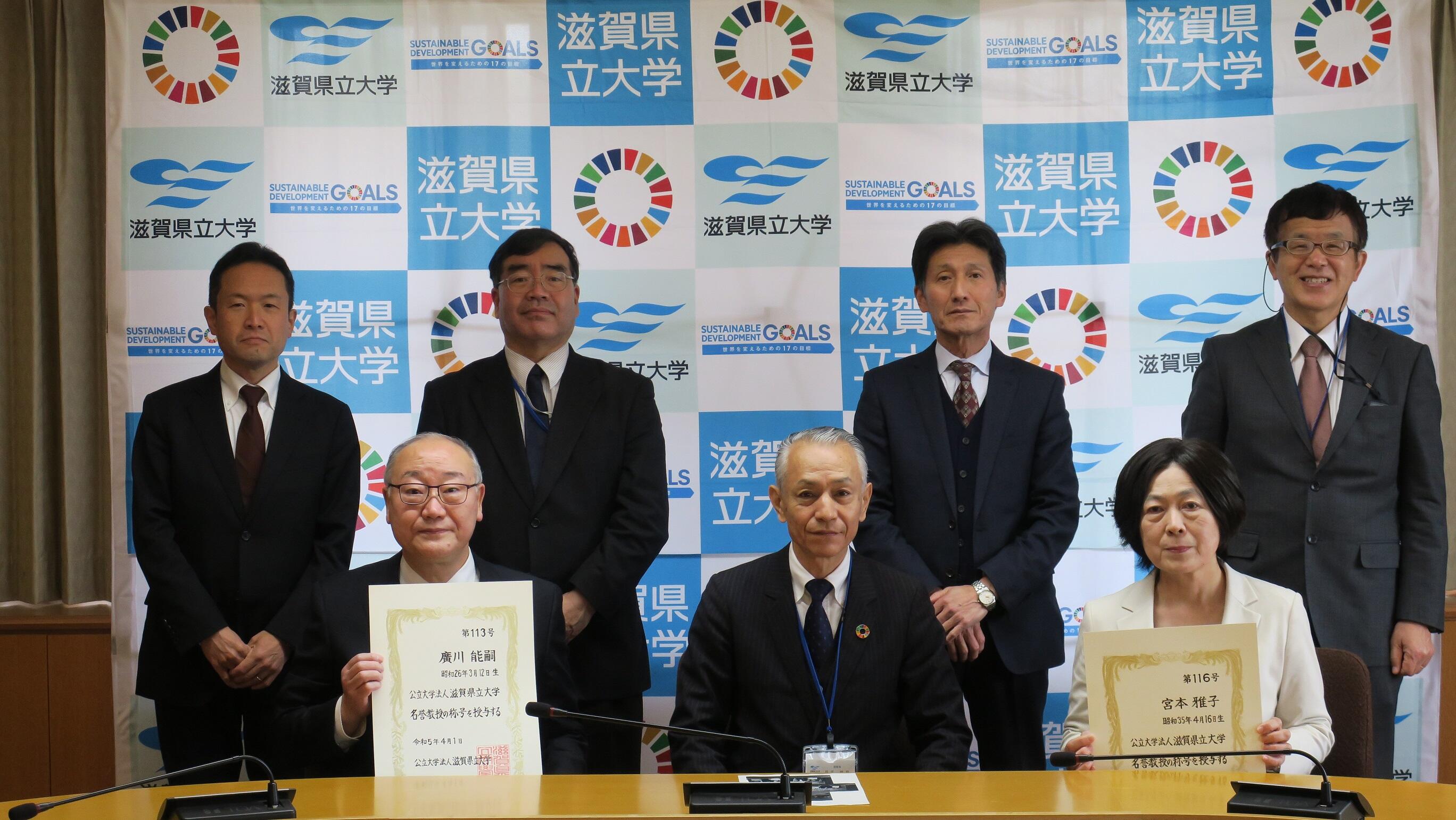 廣川能嗣先生(前理事長・学長)、安原治先生(前理事・副学長)、大久保卓也先生(元環境科学部教授)、宮本雅子先生(元人間文化学部教授)、甘佐京子先生(元人間看護学部教授)