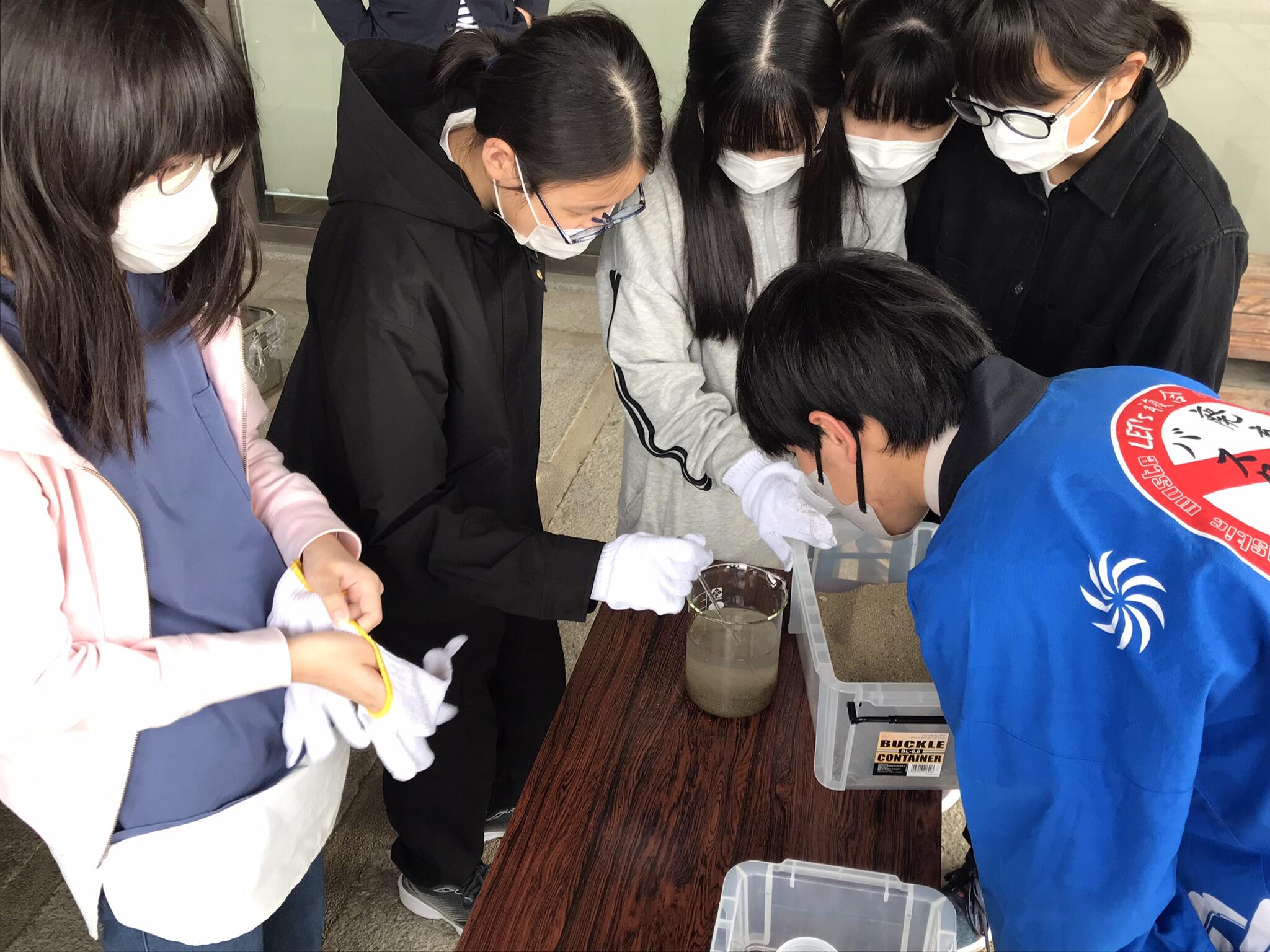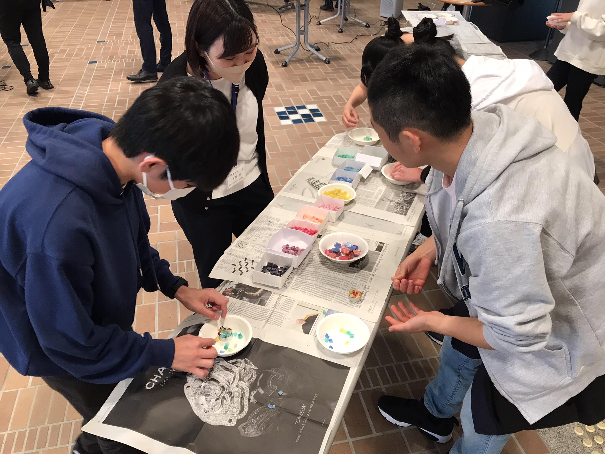 滋賀県立大学の会場では、近江楽座チーム「あかりんちゅ」と「廃棄物バスターズ」が40名の中学生に活動の紹介を行いました。その後は小グループに分かれて、お寺から出る残ろうそくをリサイクルしてのブロックキャンドル作製や琵琶湖岸の砂の中からマイクロプラスチックを見つけるワークショップを行いました。