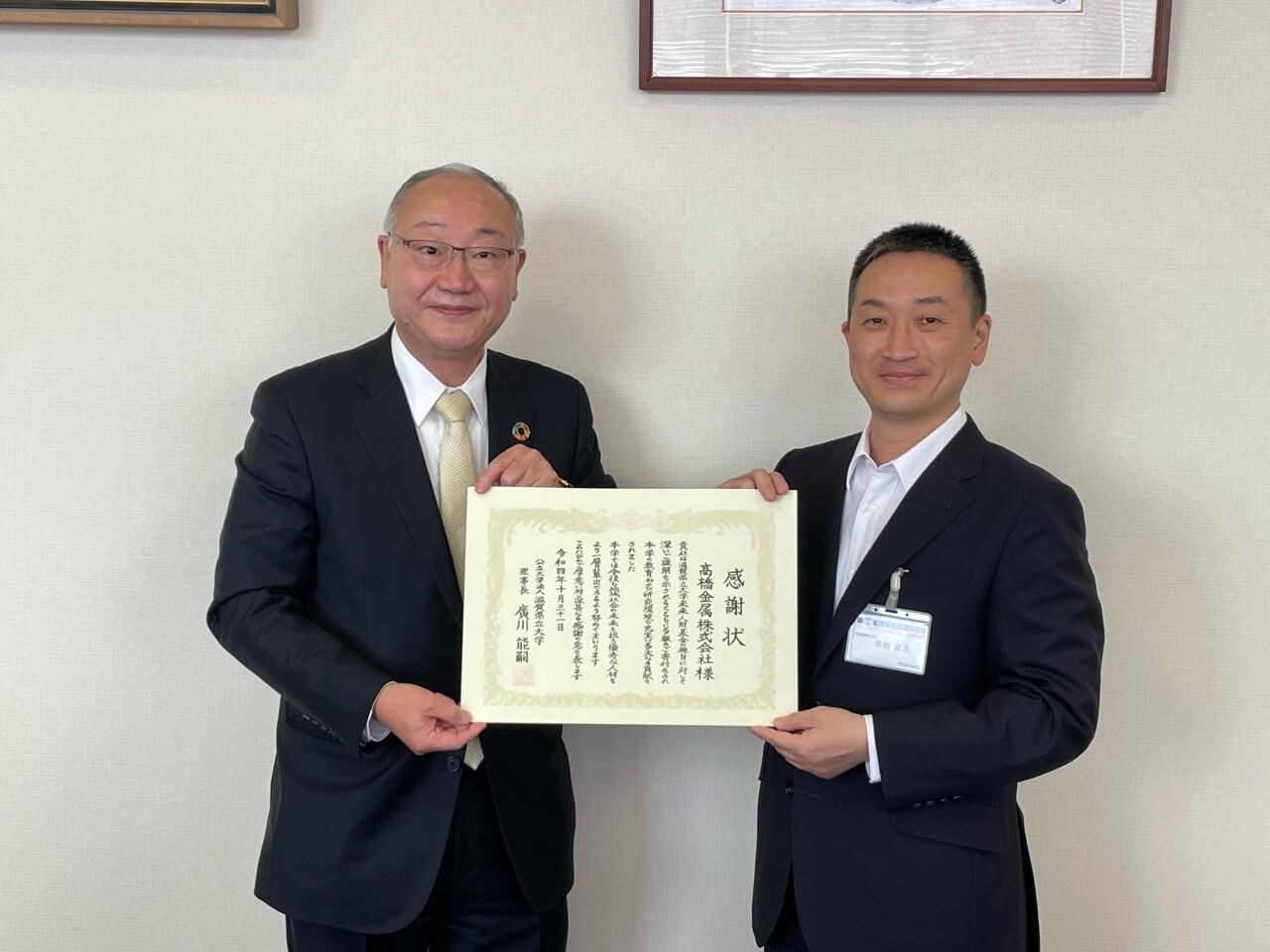 令和4年10月31日、本学理事長から髙橋金属株式会社 髙橋康之 代表取締役社長に、本学未来人財基金への多額のご寄附に謝意を表し、感謝状を贈呈しました。