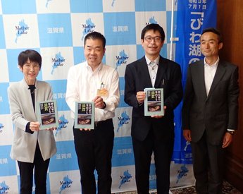 発売日(6月23日水曜日)には、三日月知事に出版の報告・贈呈をするとともに、本書のPRを行いました。特に本書はA5判で携帯しやすい大きさであり、現地でのまち歩きに不可欠な歴史情報を豊富な図版をもとにして丁寧に解説していること、また本書に掲載されているまち歩きの推奨ルートに沿って歩けば、様々な時代の滋賀の魅力を再発見できることをご案内しました。