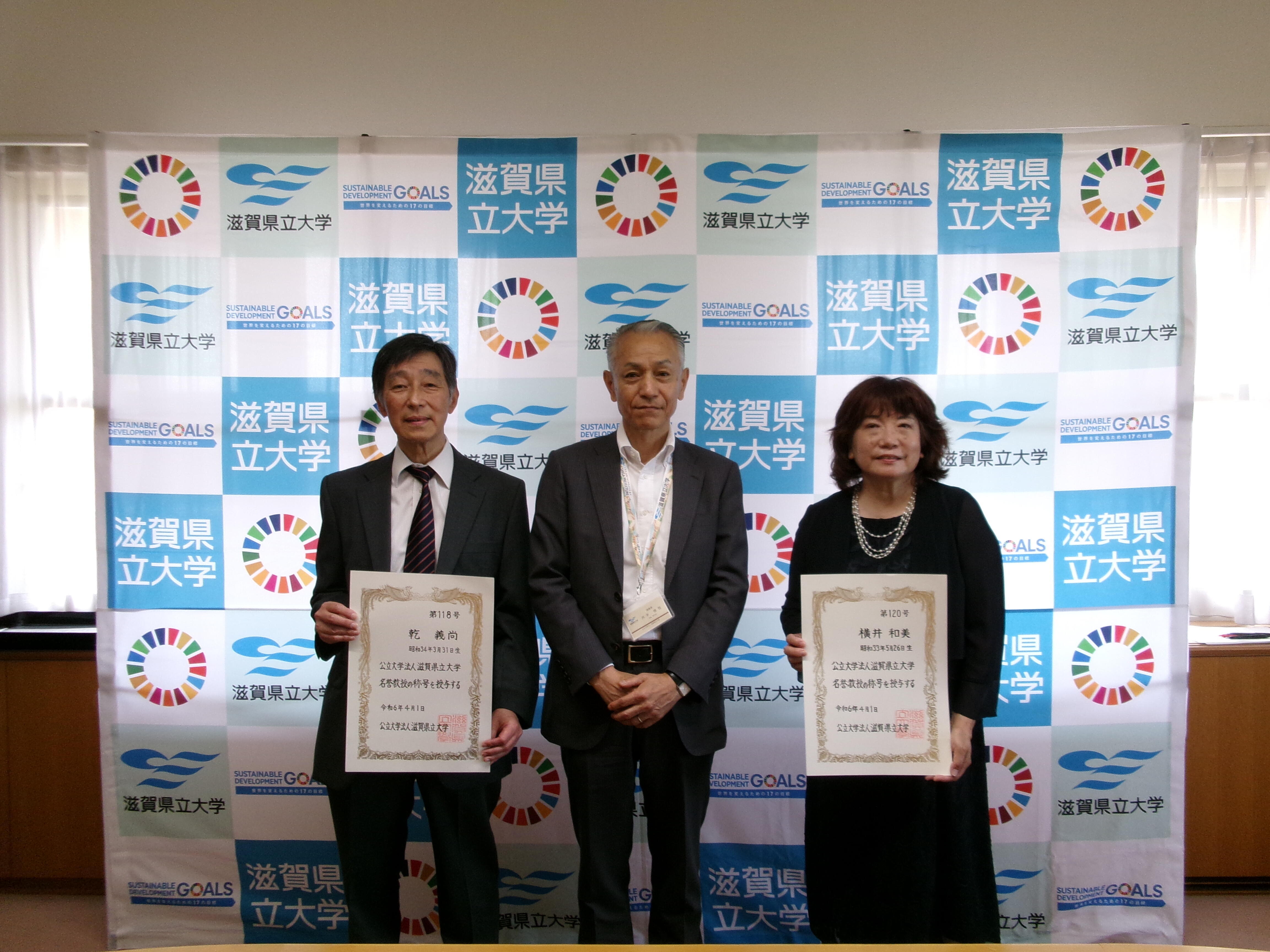 本年3月に退職されました乾義尚先生と横井和美先生が出席され、井手理事長より名誉教授の称号が授与されました。