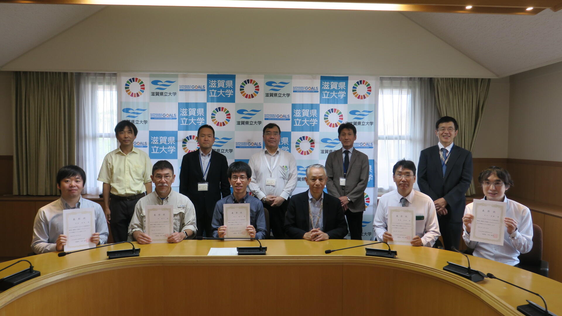 令和6年6月25日(火曜日)、本学評議会室において、大型研究の推進に顕著な貢献をした教員への表彰を行いました。これは、公立大学法人滋賀県立大学職員表彰規程等に基づき、前年度の外部資金間接経費獲得額の多かった者を表彰するもので、平成25年度の創設以来、今回で12回目の表彰となります。