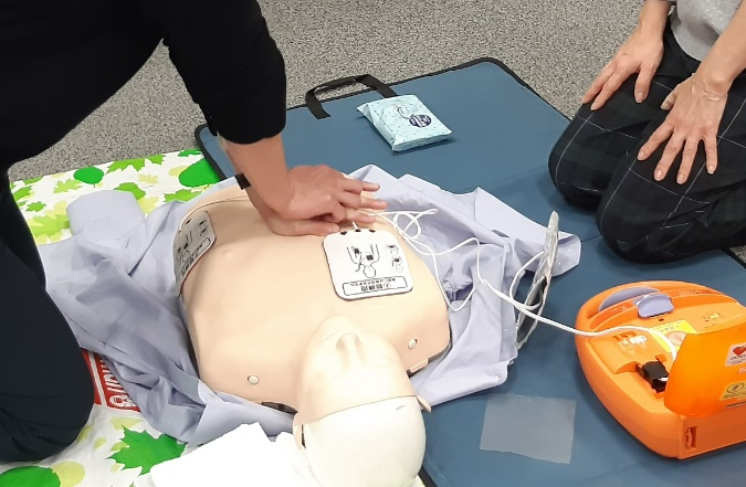 参加者はあらかじめWEB講習と確認テストにより基礎知識を学び、この日は3チームに分かれ、胸骨圧迫による心肺蘇生法、AED(自動体外式除細動器)の使用方法など、練習用の人形を使った実技を行いました。