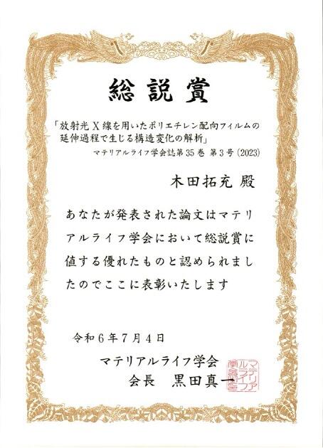 マテリアルライフ学会の総説賞は、昨年度一年間にマテリアルライフ学会誌に掲載された論文・総説の中で、特に優れた論文・総説に対して与えられます。なお、今回総説賞として選出された総説は、マテリアルライフ学会誌Vol. 35,No.3,pp.66-71(2023)に掲載されています。
